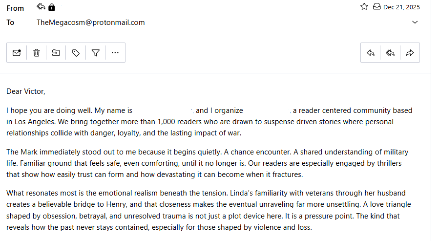 The email was long, eloquent, and effusive with praise. It knew peripheral details about The Mark, using such keywords like military, and obsession to give the impression it had been read.