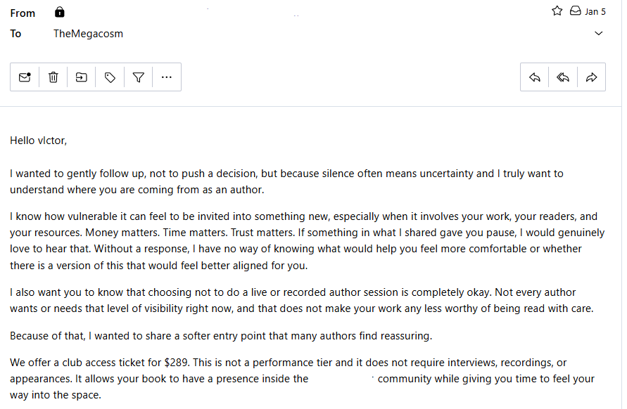 The email was full of flowery praise that no real person would take the time to write, even for a author that loved.