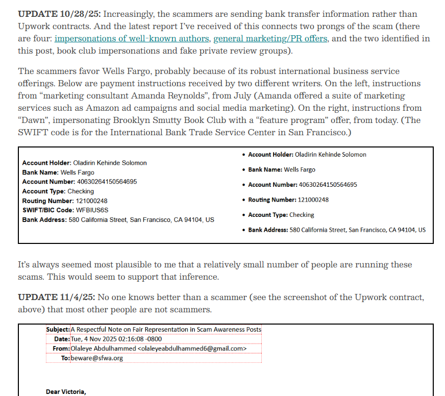 Then there was the offer of pay-to- play. Had I gone forward, Writer Beware details the various payment options the scammers employ, which include paypal, bank wire transfers, and even Upwork contracts to make the author feel the scam is legitimate. There is more to the scam and I highly recommend reading the Writer Beware article as the scam can vary.